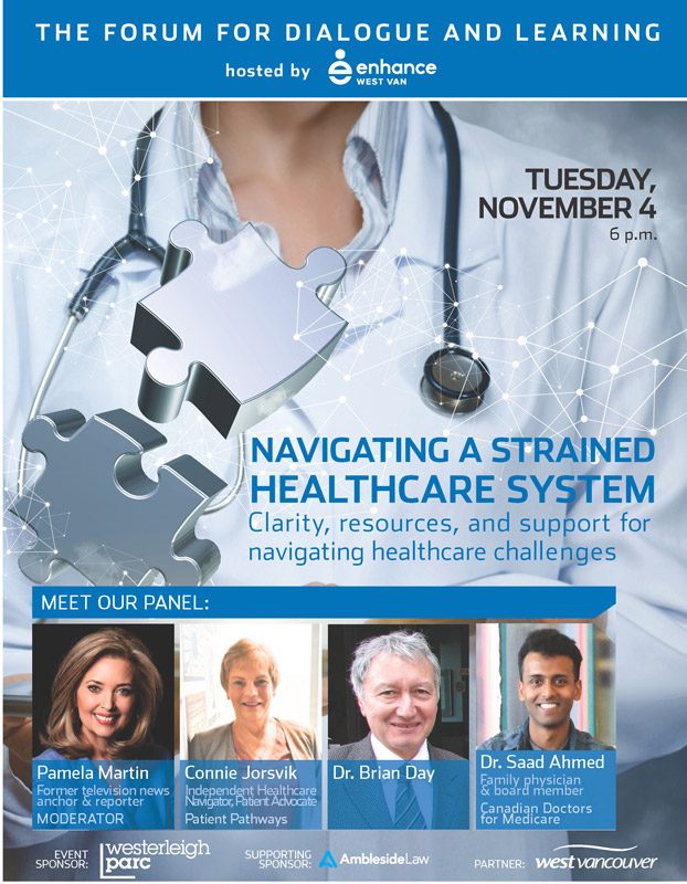 Thank you for attending this community forum hosted by Enhance West Van. Our panel of experts explored challenges in our healthcare system, universal access, advocacy and private vs public options.